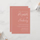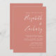 Este simples convite de casamento moderno apresenta um texto branco sobre um fundo de terracota. Adicione os nomes da noiva e do noivo na caligrafia de escrita manual do na moda e os detalhes na fonte sans serif. O verso oferece espaço para detalhes do casamento, juntamente com um código QR que os convidados podem digitalizar para visitar seu site e RSVP, o que economiza o custo de impressão e envio de RSVP separados.