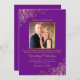 Este belo convite de casamento é na moda, simples e elegante. Ele apresenta letras douradas em um fundo roxo com filtro floral de folha falsa em cada canto. O design inclui a sua fotografia num quadro de ouro juntamente com todos os detalhes importantes. A parte traseira tem um código QR personalizável e uma nota de detalhes para que você possa direcionar seus convidados para um site para informações e RSVP.