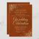 Este belo convite de casamento é na moda, simples e elegante. Apresenta uma inscrição dourada num fundo cor laranja ou numero queimado, com um filtro de folha de alumínio floral em cada canto. A design subestimada é compensada pelas ampolas e espirais do trabalho de arte. A parte traseira tem um código QR personalizável e uma nota de detalhes para que você possa direcionar seus convidados para um site para informações e RSVP.