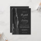 A borda esquerda deste elegante convite de casamento moderno apresenta uma coloração aquosa preta e borda agitada com falso brilho prateado. O texto personalizável combina manuscrito, fontes em copperplate e itálico em cinzas prateadas leves em um fundo fora do preto. O verso fornece espaço para detalhes do casamento em um fundo escuro sólido, junto com um código QR que os convidados podem digitalizar para visitar seu site e RSVP, o que economiza o custo de imprimir e enviar cartões RSVP separados.