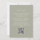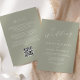 Este simples e elegante convite de casamento moderno apresenta um texto branco sobre um fundo verde sábio. As palavras "O Casamento" aparecem na escrita da na moda. Adicione os nomes dos casais na fonte do serif e o texto restante no sans serif. O verso oferece espaço para detalhes do casamento, juntamente com um código QR que os convidados podem digitalizar para visitar seu site e RSVP, o que economiza o custo de impressão e envio de RSVP separados