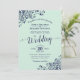 Este belo convite para o casamento apresenta um design simples, mas elegante, com uma caligrafia azul-marinho em um fundo verde-menta e um filigre azul-marinho friamente nos cantos. A parte traseira apresenta uma colagem de três fotos, adicionando um pouco de diversão e diversão aos seus convites.
