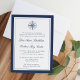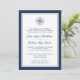 Os convites para casamentos náuticos bordados pelo azul-marinho elegante apresentam uma ilustração de bússola no topo com seus detalhes de casamento em escrita clássica e letra serif. Cartões inversos a marinhos estreitos e faixas brancas costeiras.