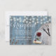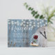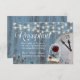 Cartões de Recepção de Casamento de Celeiro Azul Empoeirado com Luzes de Corda de Conto de Fadas Rústico.