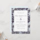 Um convite de casamento bonito e elegante, que inclui um padrão floral de cor d'água de fundo de hortênsias azuis e folhas sobre fundo azul de ardósia escura/carvão, sobreposto com uma estrutura de retângulo duplo. Os detalhes de casamento estão na fonte azul de carvão azul. O reverso está em azul sólido/poeirento. Esta design funcionaria bem para um casamento no inverno.