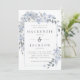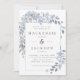Um bonito e elegante convite de casamento, com um quadro de habilidades azuis em cascata e folhas em fundo branco. O centro contém um retângulo branco azul claro com bordas, com detalhes de casamento em azul ardósia e fonte de serifa de carvão. O reverso está em azul sólido/poeirento. Este design é excelente para um casamento no inverno.