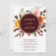 Este convite de casamento apresenta flores amarelas, cor-de-rosa-claro, cor de laranja, e folhas verdes, arborizadas, marrons com uma estrutura em círculo. É perfeito para um casamento no outono.