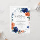 Convite para casamento floral de cor d'água elegante. Belo convite para o casamento floral moderno, com flores pintadas à mão em azul marinho e laranja queimado com um roteiro elegante de caligrafia. Você pode personalizar o texto, o estilo da fonte, a cor e o tamanho em frente e atrás do convite. Por favor, sinta-se à vontade para contactar-me para obter os itens correspondentes.