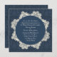 Convite de casamento chic feito em azul na cor damasco floral de denim azul. Gráficos de um marfim elegante crochetado, que parecem decorar suavemente o meio, com uma área de texto azul circular, sobre o rabo. O texto no marfim está pronto para personalizar o seu dia especial. A parte de trás do convite tem a mesma cor damasco de denim azul. Um convite elegante que você vai gostar por anos.