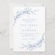 Convite de casamento azul e branco minimalista, coroa de folhas botânicas elegante e ilustrada com a mão, com detalhes do evento na escrita moderna e fonte clássica. Simples e luxo. Excelente para casamento clássico moderno, casamento formal simples, casamento botânico elegante. Veja todas as peças correspondentes na coleção.
