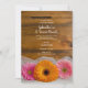 Convide os convidados para os vossos núpcias do estilo fazenda com o encantador Convite para Casamento de Daisy Trio Country. Este casamento do tema rústico do rancho personalizado apresenta uma fina fotografia floral de duas margaridas cor-de-rosa e uma flor da margarida laranja gerber com um véu branco e um fundo de madeira marrom e casada. Inpo perfeito ou ideia para a sua cerimônia de casamento e recepção casual do celeiro. Disponível como um convite impresso para envio por correio ou como um download digital para fácil compartilhamento digital online.