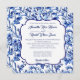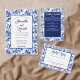 Um convite para o casamento com um design de torre azul e branco com flores de crisântemo.