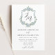 Convites de casamento florais elegantes que incluem as suas iniciais monográficas em um roteiro de caligrafia negra cercado por uma crista com hidrangeas azuis empoeiradas com folhas de eucalipto exuberantes e folhagem verde rica. Personalize os convites de casamento da hydrangea com seus nomes e detalhes de casamento abaixo.