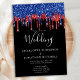 Convide seus amigos e família para comemorar seu dia especial com esses cartões de convite para casamento de preto vermelho e azul. Personalize com seus nomes e todas as suas informações de casamento. Esta coleção de casamentos tematizada da bandeira americana será uma favorita entre todos os militares, veteranos e forças armadas. Visite nossa coleção patriótica de casamento para convites para casamento vermelho branco e azul, favores de casamento, suprimentos de festa. COPYRIGHT © 2020 Judy Burrows, Black Dog Art - Todos Os Direitos Reservados. Elegante Black Red Glitter Drivers Casamento Convite