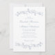 Convite de casamento elegante, com bordas de ornamentado de coloração d'água, compostas de flores e folhas delicadas, poeirentas e de cor azul. Os nomes da noiva e do noivo estão em uma escrita azul empoeirada e os detalhes do casamento estão em simples inscrições azuis empoeiradas. Perfeito para casais que abraçam a estética popular do milênio, misturando o romance de uma era passada com um toque refrescantemente contemporâneo.