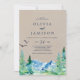 Este convite de casamento casual de destino da montanha russa é perfeito para um casamento ao ar livre. O design apresenta uma paisagem de natureza selvagem pintada, azul e verde, com pinheiros de aquarela, pássaros e montanhas em um fundo falso de papel kraft claro. Por favor, observe que isto não está impresso em papel kraft real. É um gráfico de alta qualidade feito para parecer papel kraft.