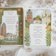 Celebre o seu casamento em Darmstadt, Alemanha, com este romântico convite de casamento de aquarela com marcas de terra icônicas como o Hochzeitsturm e a Chapel Russa. Com os detalhes florais de Art Nouveau nos pastéis suaves, este design de convite evoca o charme e a elegância da arquitetura europeia e das artes decorativas. Ideal para um casamento de destino com uma estética artística refinada.