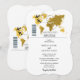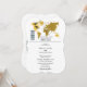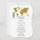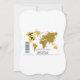 Este design apresenta um tema de passagem de embarque. Ele mostra um mapa dourado do mundo junto com dois aviões fazer forma cardíaca à medida que viagem pelo mundo. Este destino tematizado design de casamento é definido como um cartão de embarque com a data do casamento personalizado nos quadrados. O verso mostra o cartão de embarque com data de casamento personalizada. Um design de destino romântico com um toque elegante. Ideal para um casamento de destino, não importa onde no mundo. O perfeito design de convite para viagem de época. Também estão disponíveis itens de papelaria de casamento e outros formatos de convite de casamento.