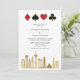 Convite moderno, elegante de Casamento de Destino de Las Vegas. A design apresenta o Skyline de Las Vegas City Em ouro, clubes, diamantes, corações e ícones de espadas em um quadro elegante de ouro e detalhes de casamento em letras de tendências na frente. Adicione a sua foto favorita ao fundo do convite.