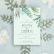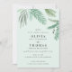 Este charmoso convite para o casamento de destino apresenta ilustrações em folha de palma de aquarela em tons de verde sobre um fundo verde-turquesa pálido inspirado nas águas claras da Costa do Golfo.