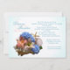 Grande concha cheio de flores, lírios e hidrangea azul com dólar de areia e estrelas-do-mar. Convite de casamento para o tema da praia elegante.