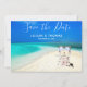 Este Casamento de Destino Salve o Cartão de Datas é projetado com um fundo oceânico com praias arenosas brancas e um fundo azul profundo do céu. Para personalizar, basta inserir seus detalhes em nosso modelo fácil, substituindo o texto de exemplo. O texto inicial inclui: Salvar a data, os nomes das noivas e do noivo e a data de casamento. O texto inverso inclui: Os Detalhes do Local de Casamento e o Convite Formal para Seguir.