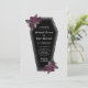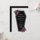 Escuro e bonito, este convite de casamento de caixão é perfeito para um casamento gótico ou de Halloween. O Coffin tem brilho de cinza nas bordas e rosas roxas com folhas verdes de ouro e cinza. Estas linhas nas bordas são um belo toque. Veja a coordenação de itens no nosso compro, Encantado Finch.