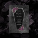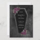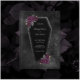 Escuro e bonito, este convite de casamento de caixão é perfeito para um casamento gótico ou de Halloween. O Coffin tem brilho de cinza nas bordas e rosas roxas com folhas verdes de ouro e cinza. Estas linhas nas bordas são um belo toque. As cores são preto, roxo, verde, prata e cinza. O fundo é uma moody black watercolor.