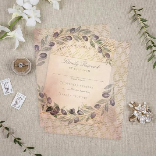 Os casais clássicos vão adorar este convite de casamento do galho de oliveira italiano, onde rustic encontra o glam. Este bonito design apresenta uma linda paleta de cores Tuscana, um detalhe de latência de falso ouro e ramos de oliveiras. Observe que este design apresenta um efeito de brilho dourado. Não é utilizada qualquer folheto ou solvente. Não há embelezamentos. É um design plano.