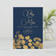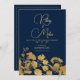Este maravilhoso design de convite para o casamento apresenta um marinho azul adorável, e convites para o casamento de flores silvestres de luxo de ouro que são perfeitos para qualquer cerimônia elegante e sofisticada. Estas elegantes folhas florais são perfeitas para casais na moda. Personalize este design com sua mensagem e informações personalizadas. Todas as designs são impressas.