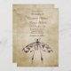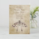 Este simples convite de casamento de estilo vintage apresenta uma libélula de cor d'água em tons de marrom contra um fundo vintage.