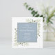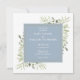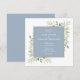 Apresentando delicadas folhas rústicas de cor d'água de eucalipto, este convite de casamento botânico moderno pode ser personalizado com seus detalhes especiais do dia do casamento em um fundo azul empoeirado. Projetado por Thisnotme©