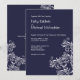 Um Convite para Casamento de Estilo Elegante Branco e Marinho desenhado com sotaque decorativo branco sobre fundo marinho, frente e verso. O texto do lado do cobrir do convite inclui: Nomes da noiva e do noivo, data de casamento, hora, local e nota de recepção. O texto do lado inverso inclui: RSVP e seus Detalhes de RSVP. Para personalizar, simplesmente insira seu texto em nosso modelo fácil, substituindo o exemplo. Certifique-se de ver toda a Coleção de Casamentos de Estilo Elegante Branco e Marinho para cartas e acessórios correspondentes.