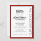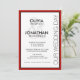 Um convite de casamento com o estilo urbano moderno, esta design como "NOSSO DIA DE CASAMENTO", na margem certa do convite com ousados sans serif face para os nomes da noiva e do noivo e um grande sotaque de ampersas juntando-se aos nomes. Uma borda vermelha e preta vibrante enquadra o texto no estilo clássico. Personalize com seus detalhes de casamento.