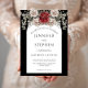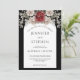 Um convite elegante para casamento por aquarela com rosas vermelhos e brancos, com eucalipto verde em fundo preto. Por favor, personalize com os detalhes do seu dia especial.
