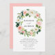 Elegante convite de casamento floral com seus nomes cercados por uma coroa de flores brancas e cor-de-rosa com folhas verdes e peludas. Personalize os convites de casamento florais cor-de-rosa com os detalhes de seu casamento abaixo. O convite para o casamento floral de aquarela é uma escolha moderna perfeita para casamentos de primavera e verão.