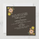 Um convite para o casamento de outono com ilustração de flores e verde, organizado em círculo com faixa no centro. Personalizar com nomes. O lado oposto apresenta flores no canto superior esquerdo e inferior direito. Personalize o texto com detalhes da sua ocasião. O fundo é marrom. A redação é dos pais da noiva.