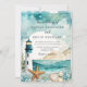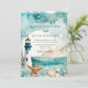Belo convite para o casamento com um farol preto e branco náutico, estrelas-do-mar e conchas. Perfeito para um casamento. As palavras podem ser alteradas para se adequarem aos seus próprios detalhes ou requisitos