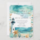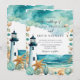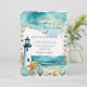 Belo convite para o casamento com um farol preto e branco náutico, estrelas-do-mar e conchas. Perfeito para um casamento. As palavras podem ser alteradas para se adequarem aos seus próprios detalhes ou requisitos