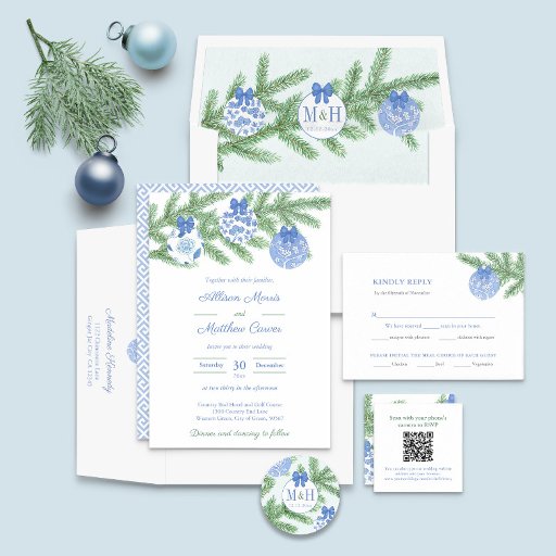 Este Natal / Holidays, convite para o casamento, mostra design pintados manualmente, em forma de chinoiserie azul e branca, em um galho de árvore de abeto.