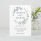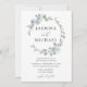 Elegantes convites para casamentos florais com seus nomes cercados por uma coroa de rosas poeirentas, azuis e brancas e hidrangeas com folhas de eucalipto e verde. Este convite de casamento floral azul empoeirado é perfeito para o seu primavera ou casamento de verão!