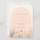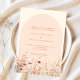 Um convite de casamento elegante. Um fundo creme, cor bege e um arco colorido de pêssego. Decorado com flores silvestres de cor d'água em bege, rosa.