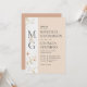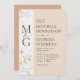 Esta elegante e moderna design é uma opção maravilhosa para o seu grande dia! O convite apresenta um fundo de pêssego claro com uma faixa branca no lado esquerdo. Nesta faixa estão as suas iniciais com um símbolo "&" bonito, dourado, com letras manuais. No topo e no fundo estão alguns elementos florais delicados e de aquarela para dar a este design um toque floral tradicional. Do lado direito, há o texto do convite em caracteres clássicos e formais. O olhar geral é floral, formal e clássico, mas com elementos design modernos.