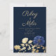 Este maravilhoso design de convite para o casamento apresenta um marinho azul adorável, e convites florais de folhagem de luxo simples de ouro que são perfeitos para qualquer cerimônia elegante e sofisticada. Estes elegantes designs florais são perfeitos para casais na moda. Personalize este design com sua mensagem e informações personalizadas. Todas as designs são impressas.
