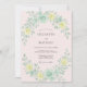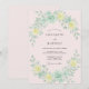 Delicada folhagem verde-menta envolve flores amarelas suaves e amanteigadas, criando uma atmosfera serena e romântica. Este design em aquarela evoca um sentimento suave e natural, perfeito para uma ocasião de primavera ou verão. A composição aérea sugere elegância e beleza discreta.