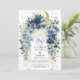 Um design de casamento luxuoso com tema celeste, com um jardim floral azul de meia-noite, sotaque de ouro, e uma lua crescente de ouro enquadrada por um arco de ornamentado. Perfeito para casais que buscam uma celebração romântica, mística e inspirada na noite estelar com detalhes cósmicos elegantes.
