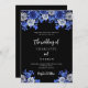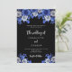 Um fundo preto, decorado com flores azuis e brancas. Personalize e adicione seus nomes e detalhes. Fundo: fundo preto.