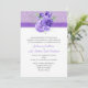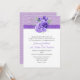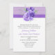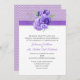 Convites românticos feitos em branco, com padrão de bolinhas roxo e branco, no topo e cobrindo o verso do convite. Gráficos de uma fita roxa, com um punhado de flores roxas, decoram o meio da fita. O texto personalizado está pronto para personalizar o seu casamento. Bonito convite com um toque caprichoso.