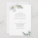 Este elegante convite de casamento botânico empoeirado e azul mostra folhas de cor d'água e flores pintadas. Os florais e o verde são feitos em tons verdes claros e cinzas num fundo branco nítido. Os nomes da noiva e do noivo e os detalhes do casamento são definidos em uma fonte clássica de sans sans sif moderna. Uma elegante escolha bófia para primavera, verão, outono ou casamentos no inverno. Projetado por Victoria of VG Invites. Para mais informações, visite www.zazzle.com/vginvites