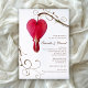 Convide convidados para a sua cerimônia romântica com o elegante Convite de Casamento Coração de Sangramento Vermelho. Este bonito convite nupcial floral personalizado apresenta uma fotografia floral próxima de uma flor de coração vermelha sangrando, ou dicentra, sobre o caule contra um fundo branco com espirais castanhos enfeitando os cantos. Inpo perfeito ou ideia para uma cerimônia de casamento e evento de recepção em um jardim floral. Disponível como um convite impresso para envio por correio ou como um download digital para fácil compartilhamento digital online.